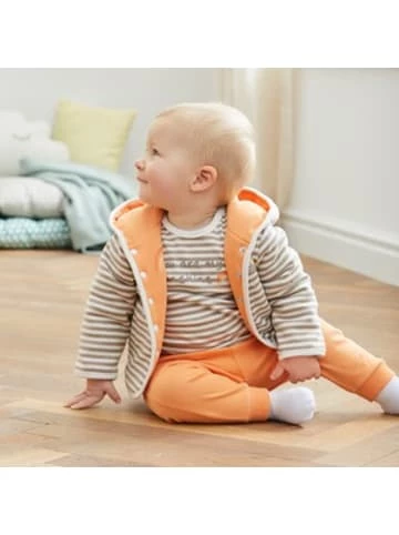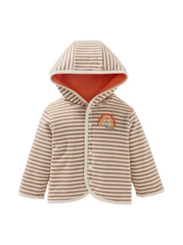 Beide Seiten der Wendejacke von BORNINO begeistern mit süßen Regenbogen-Details. Wendejacke von BORNINO mit Kapuze Seite 1: Ringel-Look mit Regenbogen-Print und „bornino“-Schriftzug Seite 2: unifarben mit Regenbogen-Print und „bornino“-Schriftzug durchgehende Druckknopfleiste auf der Vorderseite wattiert Interlock-Qualität Ober- und Innenmaterial aus reiner Baumwolle Dank Obermaterial aus reiner Baumwolle liegt die Wendejacke immer angenehm und weich auf der Haut. Die große Kapuze hält den Kopf der Kleinen kuschelig warm. Die praktische durchgehende Druckknopfleiste erleichtert das Umziehen der Kleinen. Die liebevoll designten Details machen den süßen Look der Jacke perfekt.Länge: 0,1 cmBreite: 0,1 cmHöhe: 0,1 cmPflegehinweise:* Bleichen: Nicht bleichen* Professionelle Textilpflege: Nicht trockenreinigen* Waschen: Schonwaschgang 30°* Bügeln: Bügeln mit einer Höchsttemperatur der Bügeleisensohle von 110 °C* Trocknen: Nicht im Tumbler trocknenWattierung: 100% PolyesterMaterial: 100% BaumwolleGeschlecht: Unisex